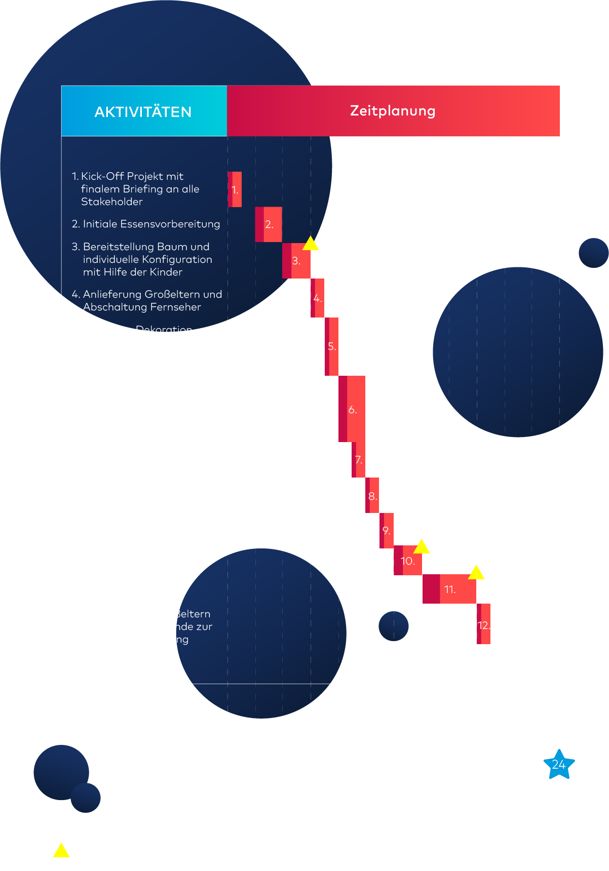 Wer Weihnachten feiert, weiß: Heiligabend ist die letzte große Herausforderung des Jahres. Zum frohen Fest mit der Familie gehören meist ein eng getakteter Zeitplan, Geschenke-Shopping „Last Minute" und natürlich die hohen Erwartungen der lieben Verwandtschaft. Wie geht man also vor, damit aus dem Projekt Weihnachten tatsächlich geruhsame Feiertage werden? Unsere Kolleg:innen aus dem Projektmanagement haben da einen klaren Plan. Kein (Weihnachts-) Wunder, denn komplexe Aufgaben mit vielen Beteiligten, harten Deadlines und wechselseitigen Abhängigkeiten sind bei PMMG Tagesgeschäft.